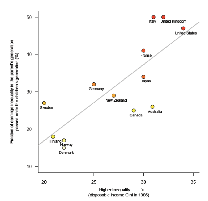 The curve plots two variables across multiple countries, namely (a) the Gini coefficient (a measure of income inequality) and (b) intergenerational earnings elasticity (a measure of how strongly parents’ earnings predict their children’s earnings).